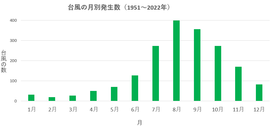 ただし、これは一般的な傾向であり、台風の発生は年によって異なる場合がありますので詳しくは気象庁のHPをご覧ください。
