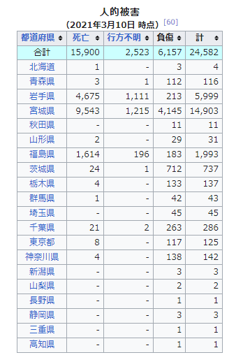 警察庁は、2021年(令和3年)3月10日時点で、死者は1万5899人、重軽傷者は6157人、警察に届出があった行方不明者は2526人であると発表しています(ただし未確認情報を含む。余震によるものを含む)。